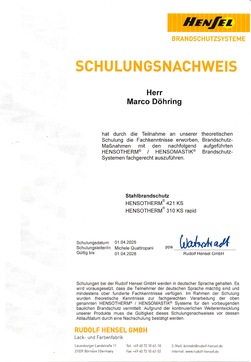 Der Betriebsinhaber hat an einer Schulung zu Brandschutzmaßnahmen mit zugelassenen Beschichtungssystemen teilgenommen und die fachgerechte Ausführung von Stahlbrandschutzsystemen erlernt.